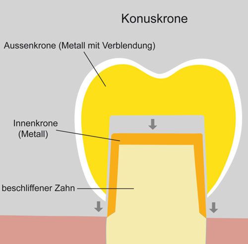 Konus bedeutet Kegel. Bei der Konuskrone laufen die beiden Teile der Krone nach oben hin geringfügig kegelförmig zu.