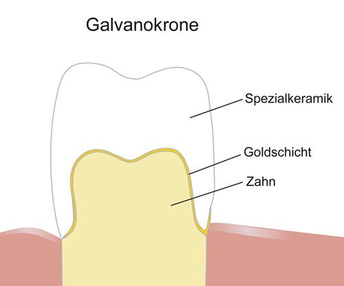 Galvanokronen (auch galvanoplastische Keramikverblendkronen genannt) sind relativ neu auf dem Markt. Ihr Grundgerüst besteht hauptsächlich aus Feingold, und sie werden von einer Keramikschicht überzogen. Die gelbliche Farbe des Feingolds schimmert durch die Keramikschicht hindurch und gibt ihr einen warmen, lebendigen Ton. Das ästhetische Ergebnis reicht an das der Vollkeramikkronen heran. Im Gegenzug weist die Galvanokrone eine noch höhere Stabilität auf als die Vollkeramikkrone. Die verwendeten Materialien sind biokompatibel, das heißt, sie sind gut körperverträglich.